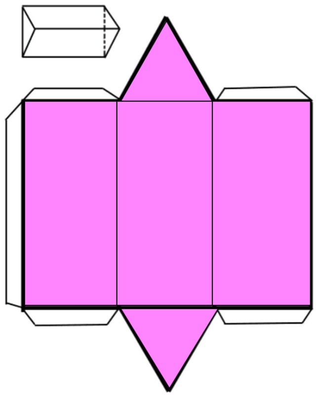 23 de Enero --Actividad 29 -- El alumno trazará el plano de prisma triangular, lo armará y decorará. Calculará el área de la base, área lateral, área total y volumen. El triángulo tendrá por la 8 cm. y altura del prisma 10cm. -- Figura --